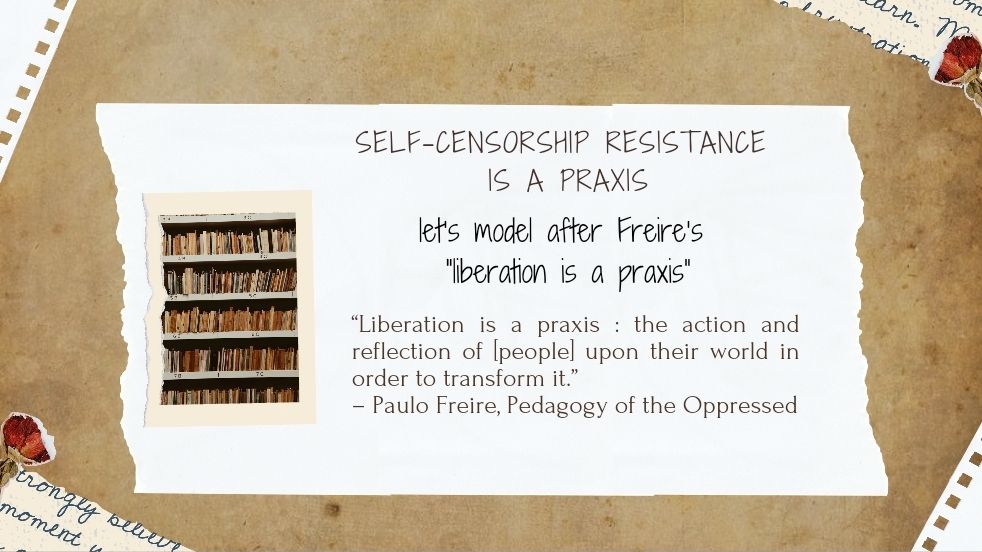 Let’s model our work on Freire’s concept—we’ll position ourselves within the framework that upholds ‘self-censorship resistance is a praxis’.