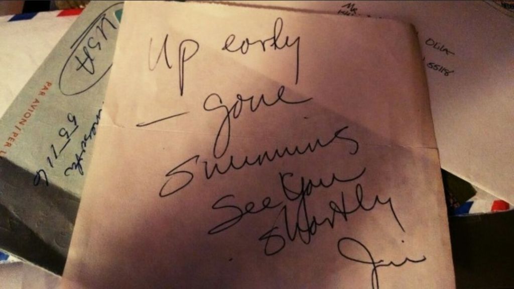 After my father died, I found a note he had written–again–at an angle. Perhaps the angled script was an expression of the way he lived–in a hurry–a hurry to experience the moment: Carpe diem. He was often up late, but then often up early, before everyone else. He would have already gone to the shops, picked up supplies for breakfast, interacted with strangers or gone swimming. Up early, gone swimming, see you shortly.