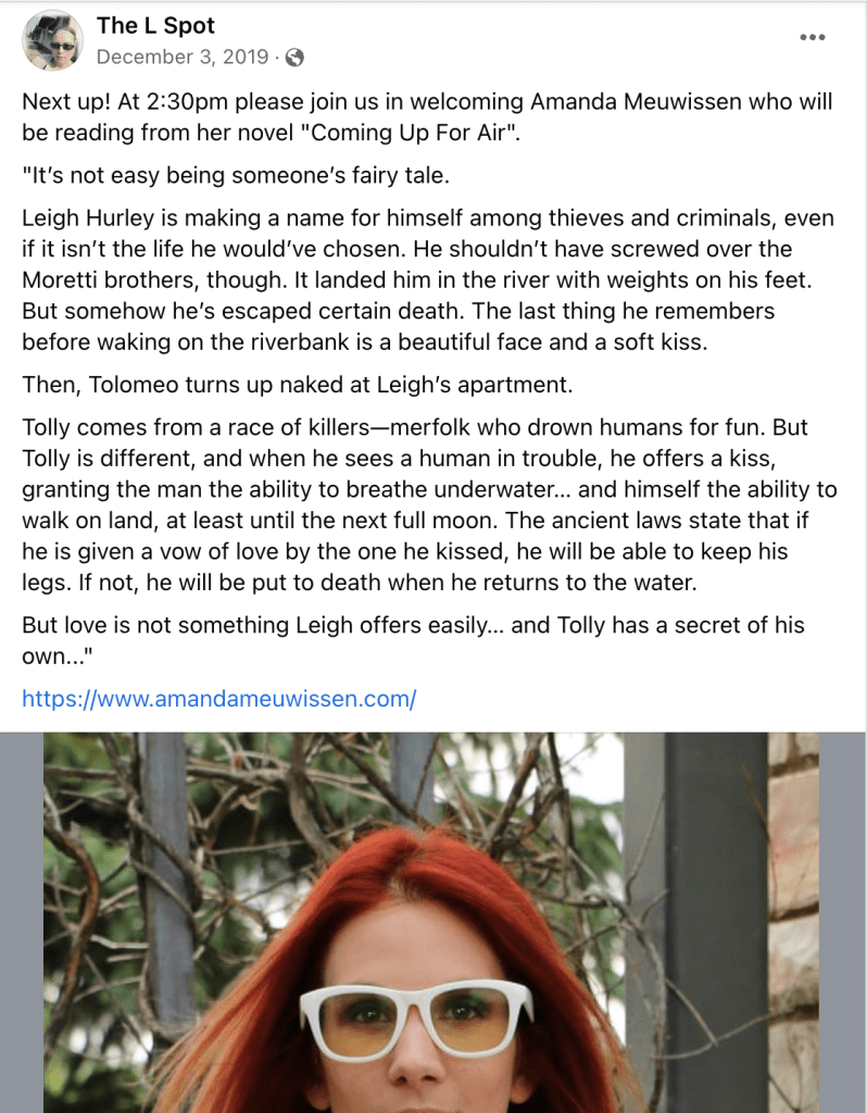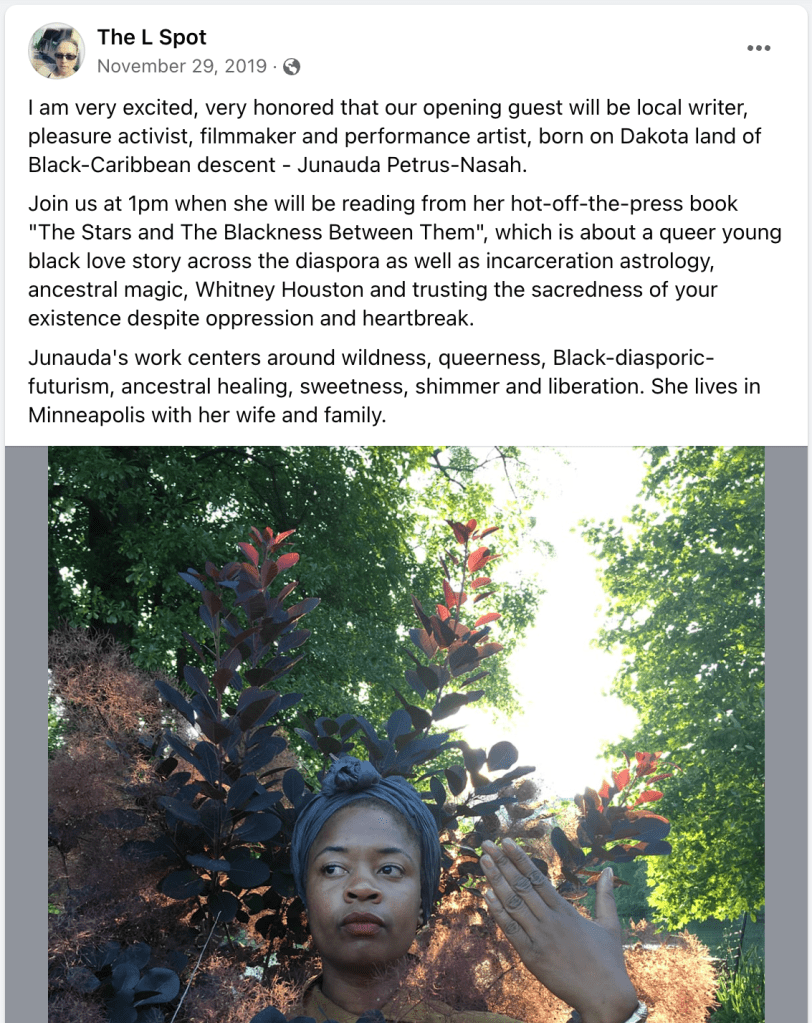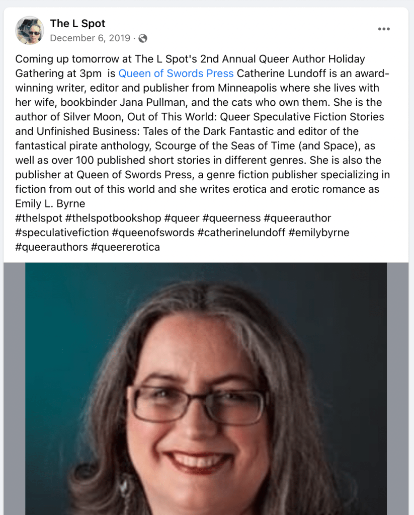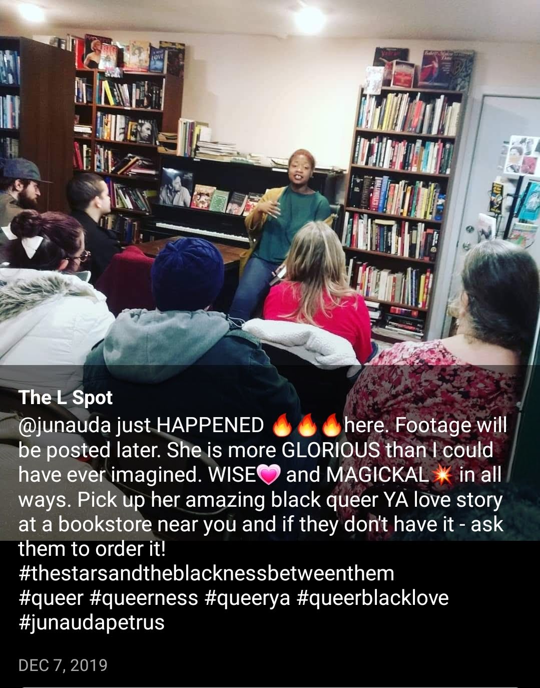 We are very excited to announce the return of The L Spot’s Annual Queer Author Holiday Gathering! Thank you to Eat My Words Bookstore for sharing their space with us. Come and make Queer- Sapphic hygge with us! Author readings, meet n greets, signing and book sales all day!